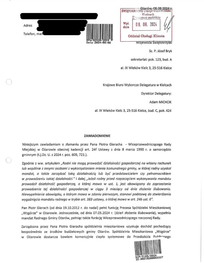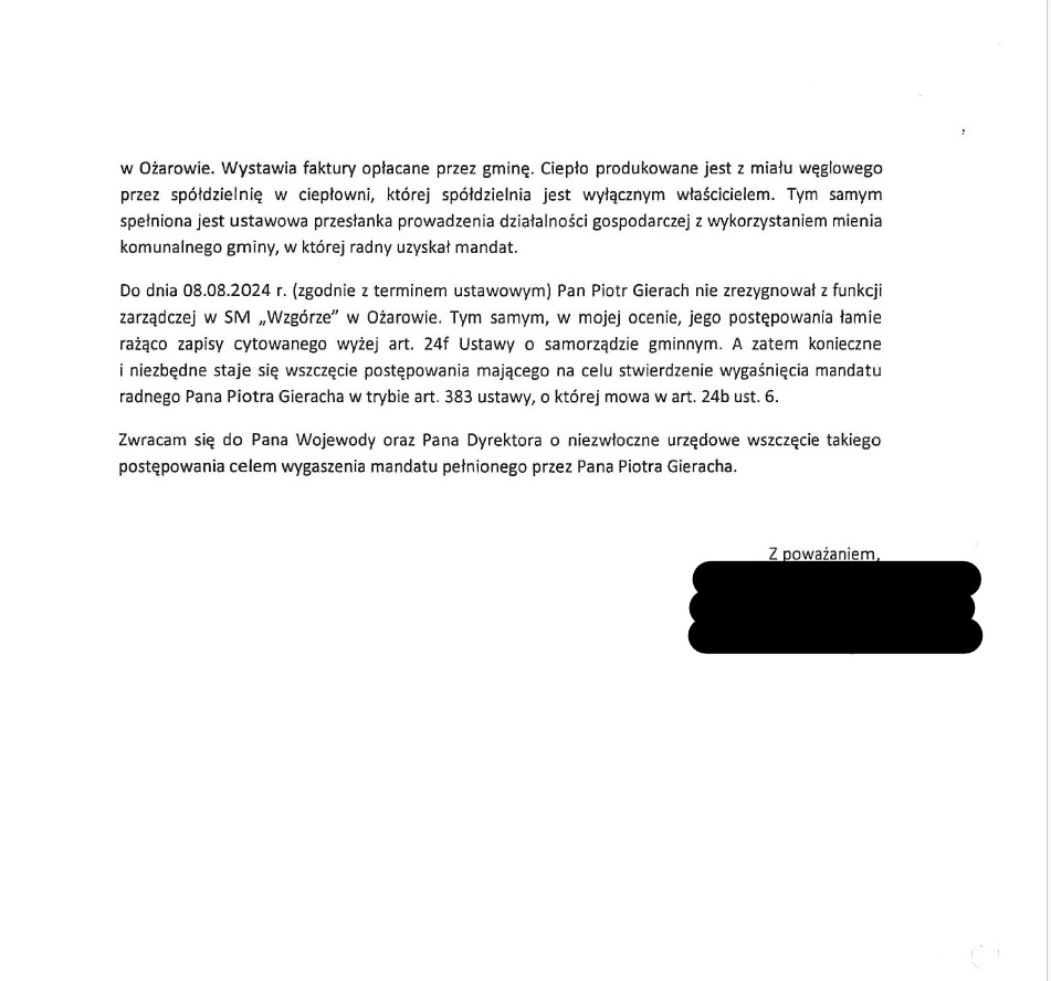 – (…) Zarządzana przez Pana Piotra Gieracha spółdzielnia mieszkaniowa uzyskuje dochód pochodzący bezpośrednio ze środków budżetowych gminy Ożarów. Spółdzielnia Mieszkaniowa „Wzgórze” w Ożarowie dostarcza bowiem komercyjnie ciepło systemowe do Przedszkola Publicznego w Ożarowie. Wystawia faktury opłacane przez gminę. Ciepło produkowane jest z miału węglowego przez spółdzielnię w ciepłowni, której spółdzielnia jest wyłącznym właścicielem. Tym samym spełniona jest ustawowa przesłanka prowadzenia działalności gospodarczej z wykorzystaniem mienia komunalnego gminy, w której radny uzyskał mandat (…) – napisał mieszkaniec gminy Ożarów. W zawiadomieniu podkreślił, że radny nie zrezygnował z funkcji prezesa w ustawowym terminie trzech miesięcy od dnia ślubowania, co stanowi podstawę do wygaszenia mandatu.