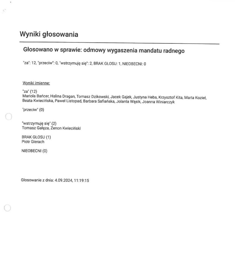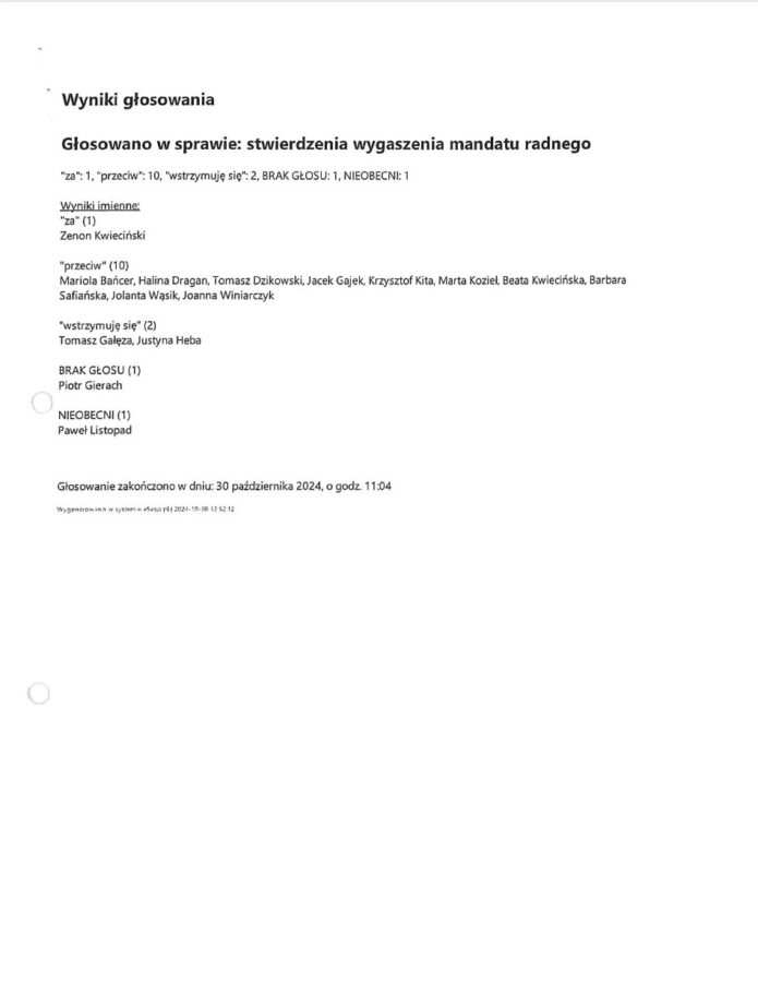 Rada Miejska ponownie zajęła się sprawą na sesji 30 października 2024 roku. Pod głosowanie poddano projekt uchwały w sprawie stwierdzenia wygaszenia mandatu radnego, przygotowany w odpowiedzi na wezwanie wojewody. Wynik głosowania był jednoznaczny – projekt został odrzucony. Za wygaszeniem mandatu opowiedział się tylko jeden radny (Zenon Kwieciński), dziesięciu było przeciw, a dwóch wstrzymało się od głosu.