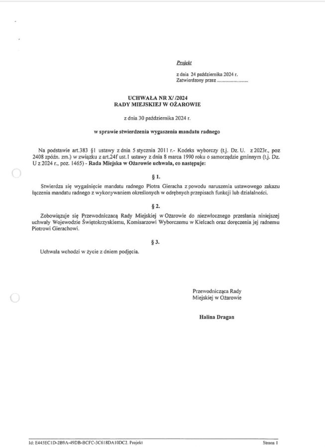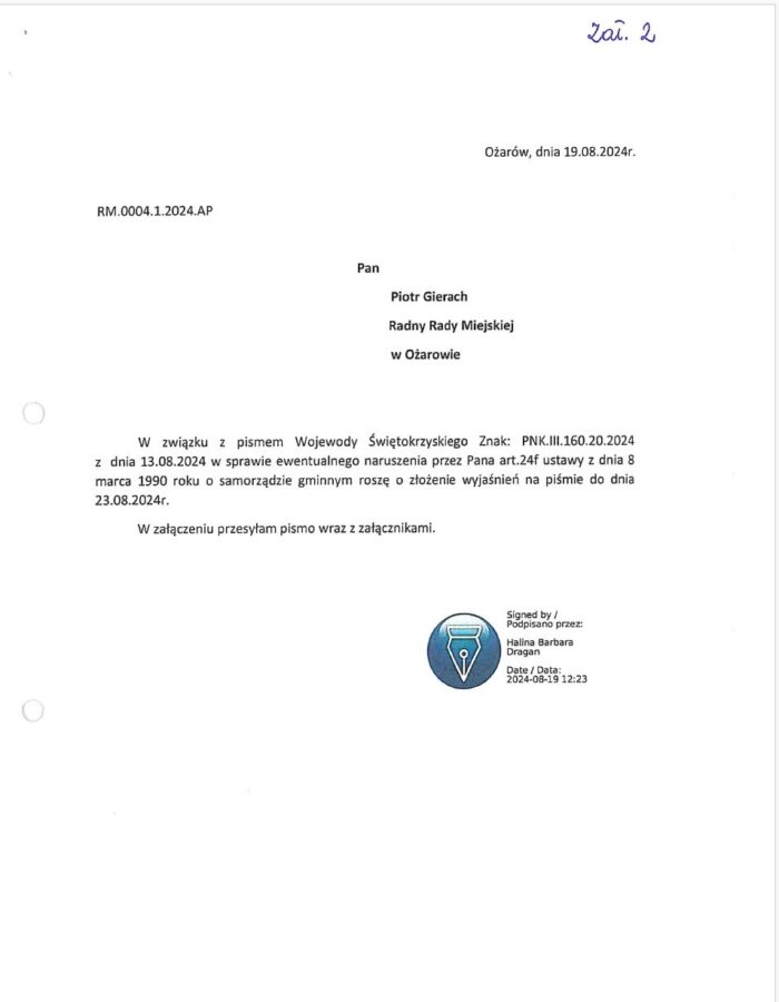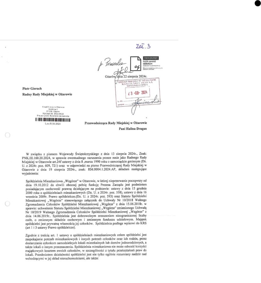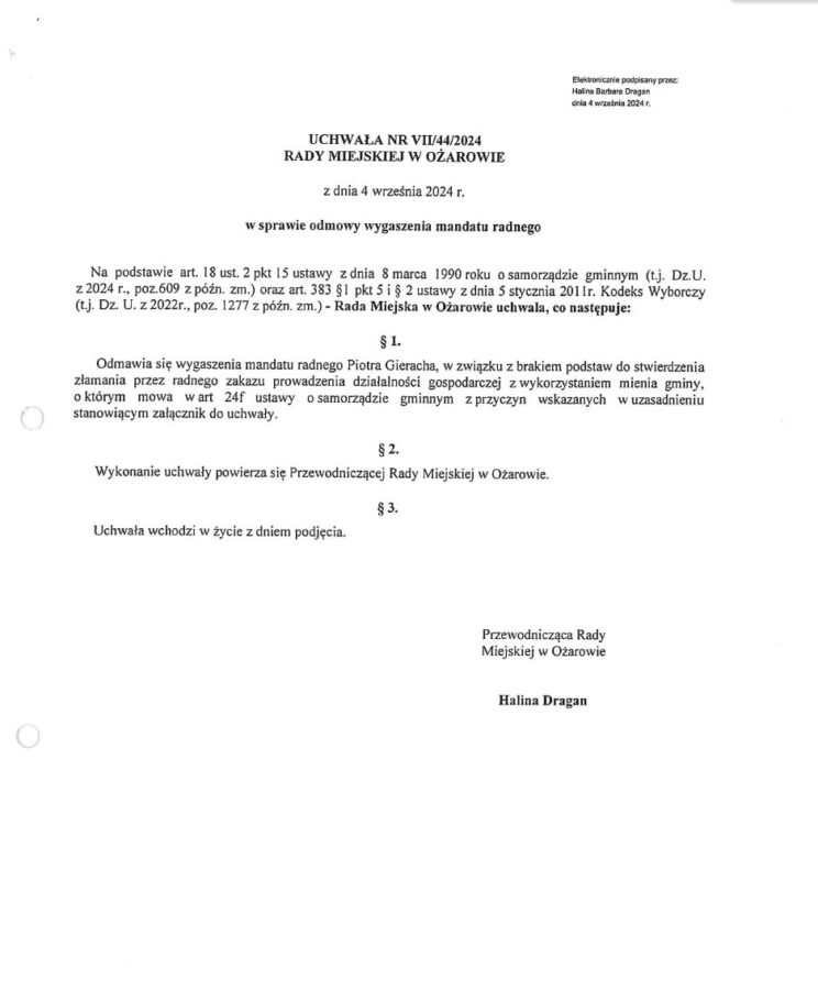 W odpowiedzi na pismo wojewody, które trafiło do Rady Miejskiej w Ożarowie, przewodnicząca rady Halina Dragan poprosiła radnego Piotra Gieracha o złożenie wyjaśnień.