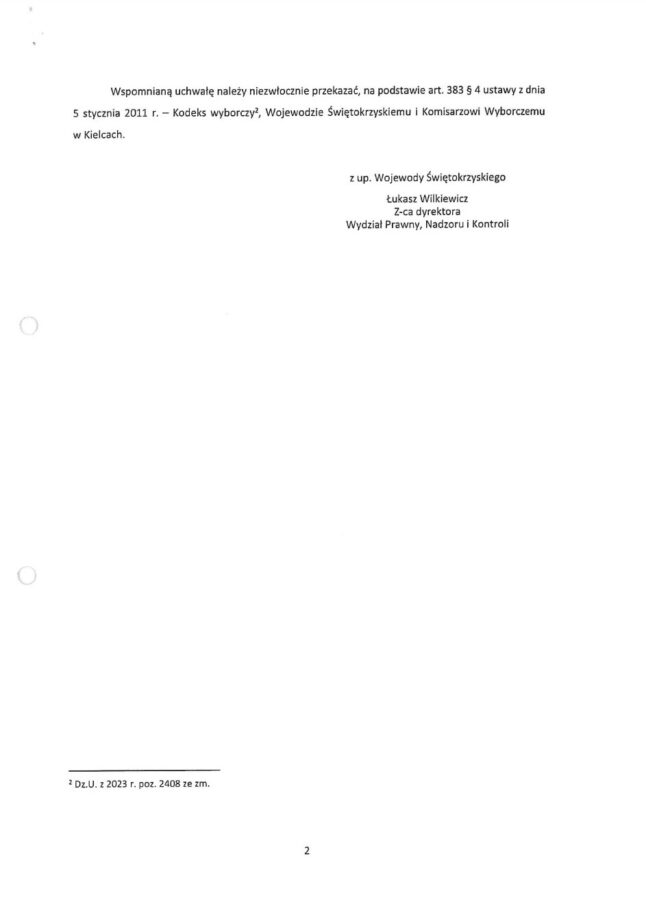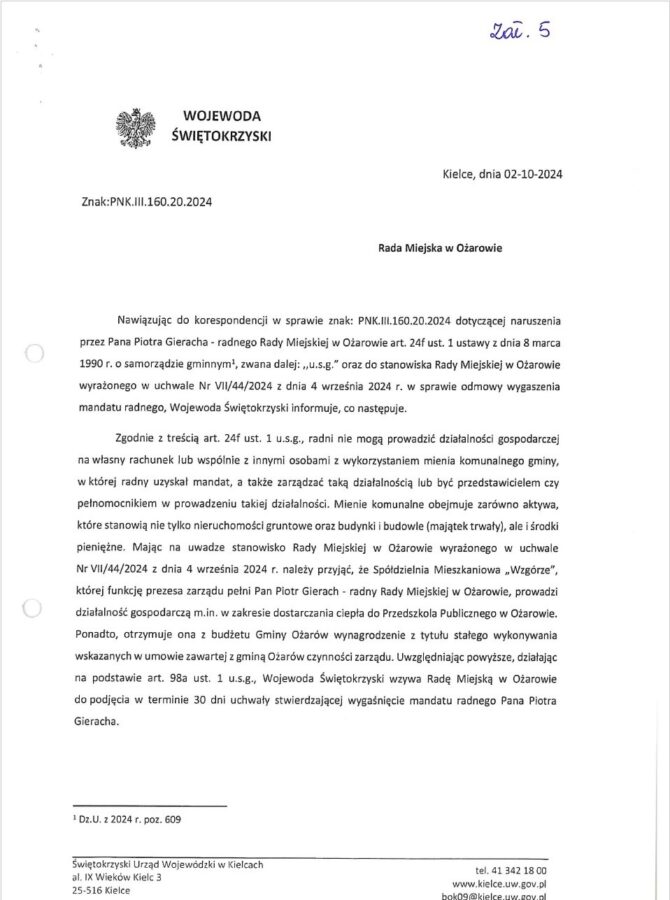 Stanowisko Rady nie przekonało jednak wojewody. W piśmie z 2 października 2024 roku organ nadzoru podtrzymał swoje stanowisko. Wojewoda podkreślił, że „mienie komunalne obejmuje zarówno aktywa, które stanowią nie tylko nieruchomości gruntowe oraz budynki i budowle (majątek trwały), ale i środki pieniężne”. Uznając, że spółdzielnia zarządzana przez radnego prowadzi działalność gospodarczą z wykorzystaniem pieniędzy z budżetu gminy, Wojewoda Świętokrzyski wezwał Radę Miejską w Ożarowie do podjęcia w terminie 30 dni uchwały stwierdzającej wygaśnięcie mandatu Piotra Gieracha.