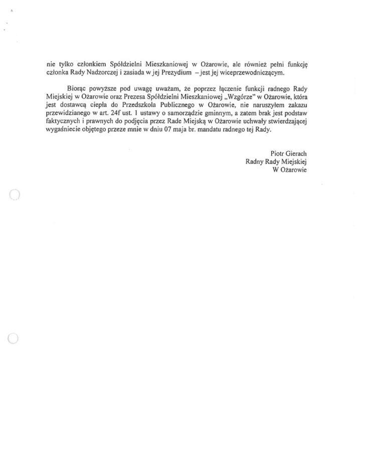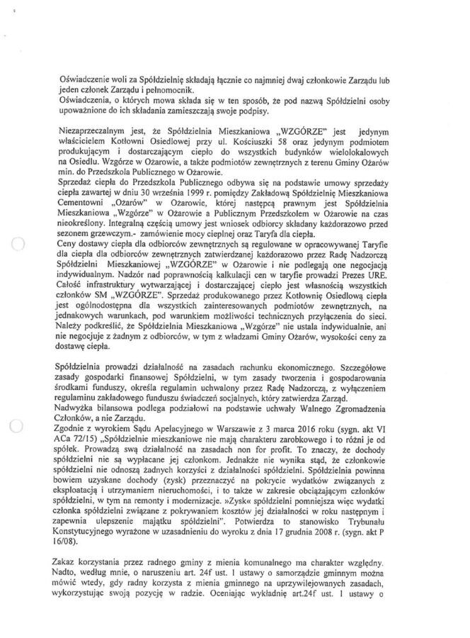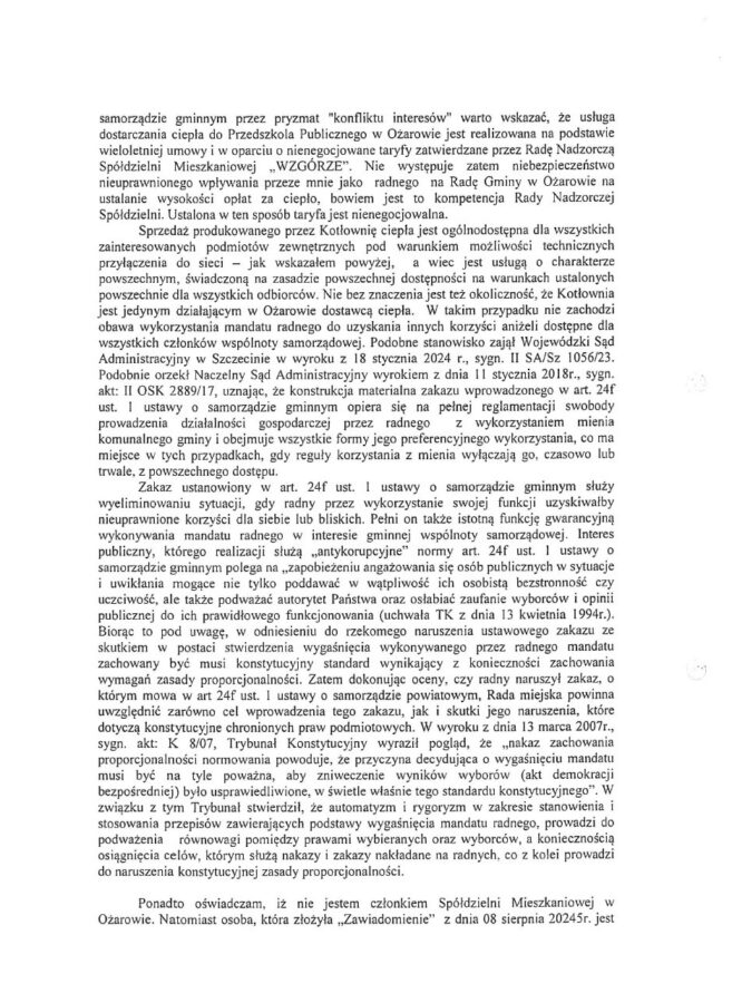 (…) o naruszeniu art. 24f ust. 1 ustawy o samorządzie gminnym można mówić wtedy, gdy radny korzysta z mienia gminnego na uprzywilejowanych zasadach, wykorzystując swoją pozycję w radzie. (…) usługa dostarczania ciepła do Przedszkola Publicznego w Ożarowie jest realizowana na podstawie wieloletniej umowy i w oparciu o nienegocjowane taryfy zatwierdzane przez Radę Nadzorczą Spółdzielni Mieszkaniowej „WZGÓRZE”. Nie występuje zatem niebezpieczeństwo nieuprawnionego wpływania przeze mnie jako radnego na Radę Gminy w Ożarowie na ustalanie wysokości opłat za ciepło, bowiem jest to kompetencja Rady Nadzorczej Spółdzielni. (…) jest usługą o charakterze powszechnym, świadczoną na zasadzie powszechnej dostępności na warunkach ustalonych powszechnie dla wszystkich odbiorców. Nie bez znaczenia jest też okoliczność, że Kotłownia jest jedynym działającym w Ożarowie dostawcą ciepła. W takim przypadku nie zachodzi obawa wykorzystania mandatu radnego do uzyskania innych korzyści aniżeli dostępne dla wszystkich członków wspólnoty samorządowej. Ponadto oświadczam, iż nie jestem członkiem Spółdzielni Mieszkaniowej w Ożarowie – wyjaśnił radny. Podkreślił, że uważam, iż poprzez łączenie funkcji radnego Rady Miejskiej w Ożarowie oraz Prezesa Spółdzielni Mieszkaniowej „Wzgórze” w Ożarowie, która jest dostawcą ciepła do Przedszkola Publicznego w Ożarowie, nie naruszyłem zakazu przewidzianego w art. 24f ust. 1 ustawy o samorządzie gminnym, a zatem brak jest podstaw faktycznych i prawnych do podjęcia przez Radę Miejską w Ożarowie uchwały stwierdzającej wygaśnięcie objętego przeze niego 07 maja 2024 roku mandatu radnego.