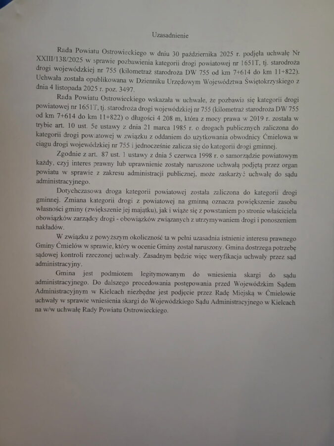 Władze Ćmielowa nie zamierzają jednak „składać broni”. Zgodnie z przepisami, Gmina ma prawo zaskarżyć uchwałę, jeśli narusza ona jej interes prawny. Wskazują, że przymusowe przejęcie drogi nakłada na samorząd obowiązki zarządcy, którym budżet Gminy Ćmielów może nie podołać.