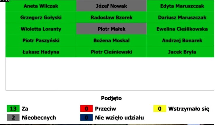 Wynik głosowania radnych Rady Miejskiej w Ćmielowie Źródło: transmisjaobrad.info