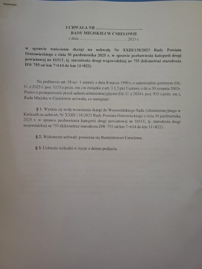 Decyzja zapadła jednogłośnie. Radni gminy Ćmielów powiedzieli stanowcze „nie” przejęciu zniszczonego odcinka starodroża (drogi powiatowej), którego remont może kosztować kilkadziesiąt milionów złotych. Podczas ostatniej sesji Rady Miejskiej w Ćmielowie, 13 głosami „za”, samorządowcy zdecydowali o skierowaniu skargi do Wojewódzkiego Sądu Administracyjnego na uchwałę Rady Powiatu Ostrowieckiego. Władze gminy argumentują, że narzucone im przejęcie drogi to cios w lokalny budżet i naruszenie interesu prawnego samorządu.