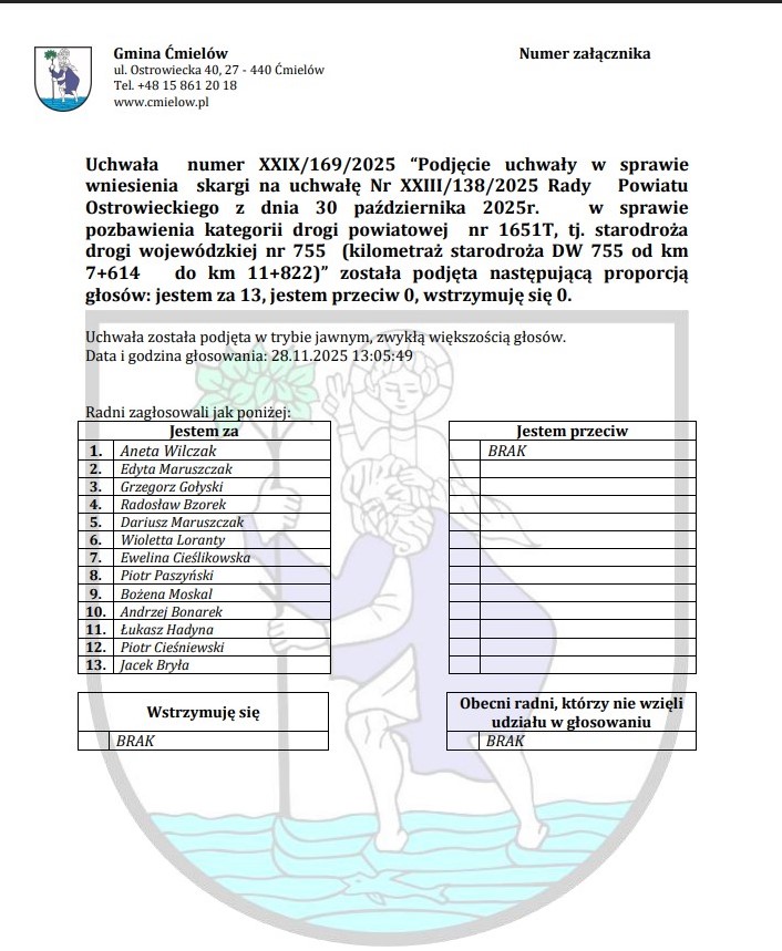 Pomimo apeli Joanny Suski, Burmistrza Ćmielowa argumentów przedstawionych podczas sesji, próśb o wstrzymanie procedowania uchwały oraz petycji podpisywanej przez mieszkańców — Rada Powiatu Ostrowieckiego 13 głosami „za” podjęła uchwałę o pozbawieniu kategorii drogi powiatowej nr 1651T i przekazaniu jej gminie Ćmielów. Tym samym to gmina, a więc jej mieszkańcy, będą musieli udźwignąć koszty jej utrzymania i remontu.