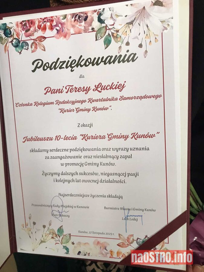 Wyjątkowy jubileusz został uroczyście doceniony 27 listopada podczas sesji Rady Miejskiej w Kunowie. Lech Łodej, Burmistrz Miasta i Gminy Kunów wręczył członkom kolegium redakcyjnego pamiątkowe dyplomy i kwiaty.