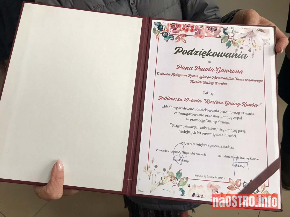 – „Kurier Gminy Kunów” to duma naszej gminy – mówi Lech Łodej. – To nie tylko promocja naszego regionu, ale przede wszystkim współczesna kronika, która zostanie dla przyszłych pokoleń. Znajdujemy tam rzeczy niezwykłe, o których często sami nie mieliśmy pojęcia. Dziękuję wszystkim, którzy tworzą i tworzyli kuriera za ich pasję i życzę kolejnych lat tak owocnej pracy – podkreśla burmistrz.