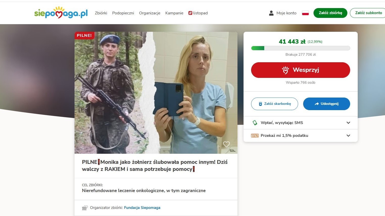 Przez Siepomaga.pl – wejdź na zbiórkę Moniki: „Pilne! Monika jako żołnierz ślubowała pomoc innym! Dziś walczy z RAKIEM…” na stronie Siepomaga.