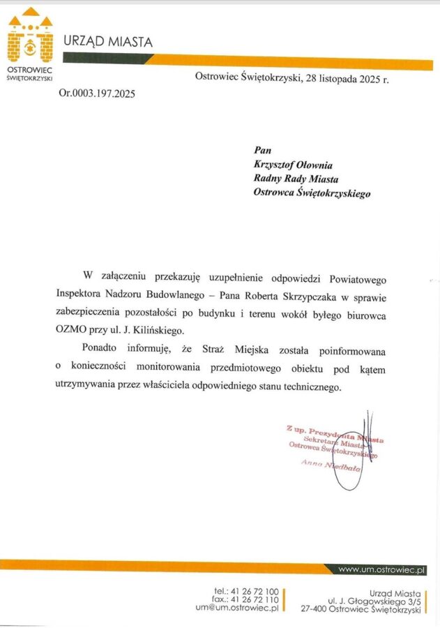 Sprawa niszczejącego budynku po dawnych Zakładach Materiałów Ogniotrwałych (OZMO) przy ulicy Jana Kilińskiego w Ostrowcu Św. od dawna budziła niepokój mieszkańców. Otwarty dostęp do piwnic, dziurawe ogrodzenie i sypiące się mury stwarzały realne zagrożenie. Temat, o którym informowaliśmy na bieżąco, trafił na forum dzięki interpelacji złożonej przez Krzysztofa Ołownię, przewodniczącego Klubu Radnych Prawa i Sprawiedliwości.