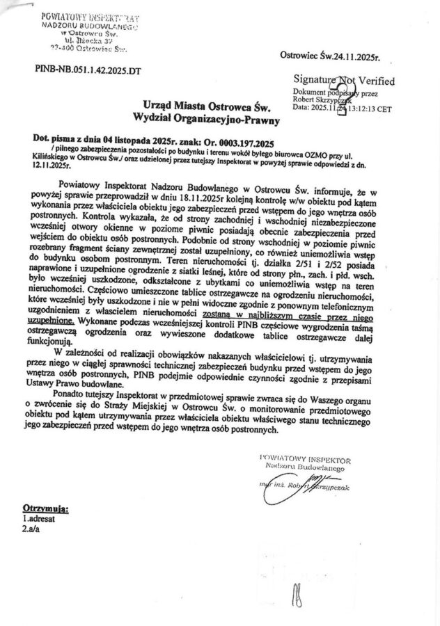 Działania radnego przyniosły wymierny skutek. Z dokumentów Powiatowego Inspektora Nadzoru Budowlanego (PINB), do których dotarliśmy, wynika, że inspektorzy przeprowadzili kolejną kontrolę 18 listopada 2025 roku.