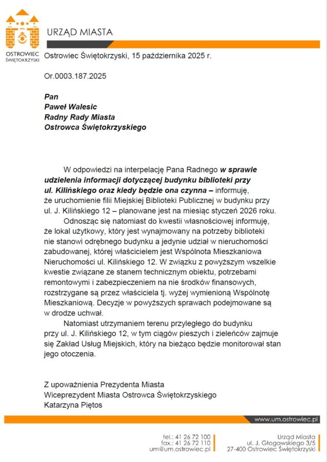 W odpowiedzi z 15 października 2025 roku, Katarzyna Piętos, Wiceprezydent Ostrowca Św. poinformowała, że planowany termin uruchomienia filii MBP w budynku przy ul. J. Kilińskiego 12 to styczeń 2026 roku.
