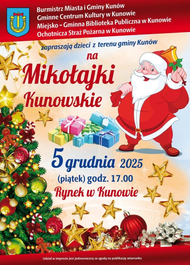 5 grudnia 2025 roku o godzinie 17.00 na rynku w Kunowie odbędą się Mikołajki Kunowskie.