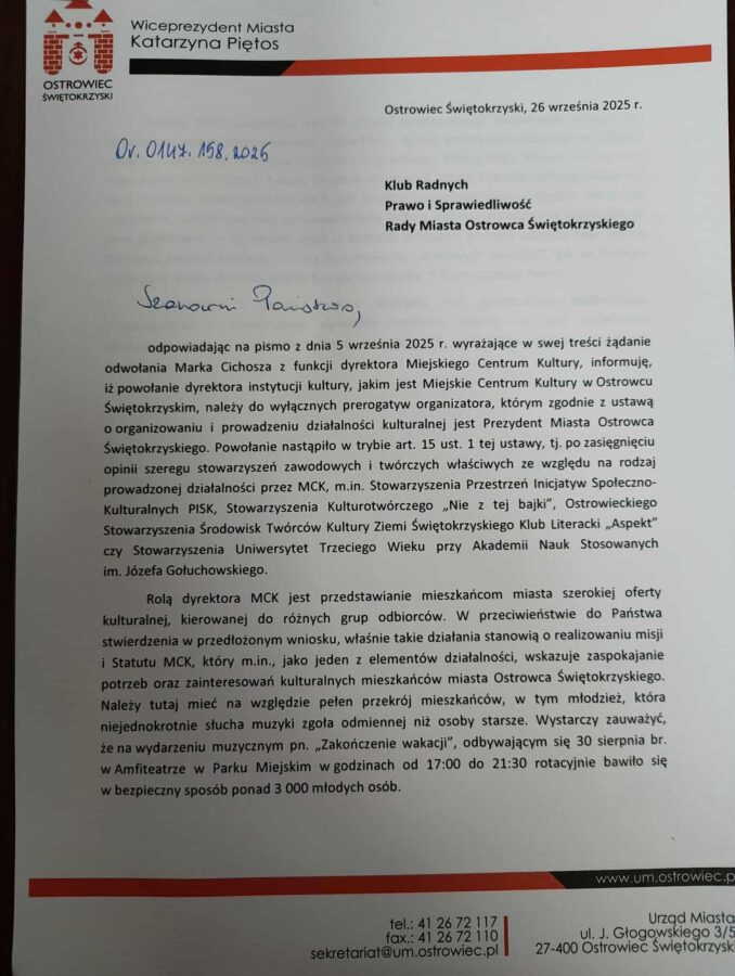 – (…) odpowiadając na pismo z dnia 5 września 2025 r. wyrażające w swej treści żądanie odwołania Marka Cichosza z funkcji dyrektora Miejskiego Centrum Kultury, informuję, iż powołanie dyrektora instytucji kultury, jakim jest Miejskie Centrum Kultury w Ostrowcu Świętokrzyskim, należy do wyłącznych prerogatyw organizatora, którym zgodnie z ustawą o organizowaniu i prowadzeniu działalności kulturalnej jest Prezydent Miasta Ostrowca Świętokrzyskiego. Powołanie nastąpiło w trybie art. 15 ust. 1 tej ustawy, tj. po zasięgnięciu opinii szeregu stowarzyszeń zawodowych i twórczych właściwych ze względu na rodzaj prowadzonej działalności przez MCK, m.in. Stowarzyszenia Przestrzeń Inicjatyw Społeczno-Kulturalnych PISK, Stowarzyszenia Kulturotwórczego „Nie z tej bajki”, Ostrowieckiego Stowarzyszenia Środowisk Twórców Kultury Ziemi Świętokrzyskiej Klub Literacki „Aspekt” czy Stowarzyszenia Uniwersytet Trzeciego Wieku przy Akademii Nauk Stosowanych im. Józefa Gołuchowskiego – czytamy w piśmie.