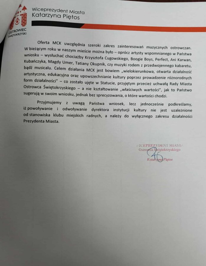 – (…) Celem działania MCK jest bowiem „wielokierunkowa, otwarta działalność artystyczna, edukacyjna oraz upowszechnianie kultury poprzez prowadzenie różnorodnych form działalności” – co zostało ujęte w Statucie, przyjętym przecież uchwałą Rady Miasta Ostrowca Świętokrzyskiego – a nie kształtowanie „właściwych wartości”, jak to Państwo sugerują w swoim wniosku, jednak bez sprecyzowania, o które wartości chodzi. Przyjmujemy z uwagą Państwa wniosek, lecz jednocześnie podkreślamy, iż powoływanie i odwoływanie dyrektora instytucji kultury nie jest uzależnione od stanowiska klubu miejskich radnych, a należy do wyłącznego zakresu działalności Prezydenta Miasta – napisała Katarzyna Piętos, Wiceprezydent Ostrowca Św.